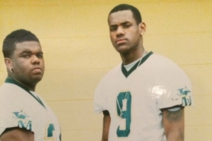 詹姆斯转发了媒体rare_sports发布的他和高中队友Sian Cotton身穿圣文森特圣玛丽高中橄榄球队球衣的合照。