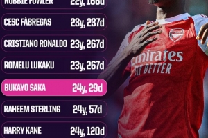 以下为英超历史达成直接参与100球最年轻纪录榜,萨卡位列第7。