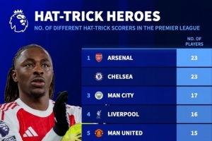 英超戴帽球员数量排名(球员多次戴帽只算一人):