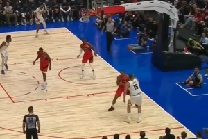 当时约基奇被打,转身之后底线一端单臂大抡传将球送给另一端的卡梅隆-约翰逊,但后者三分没能命中。